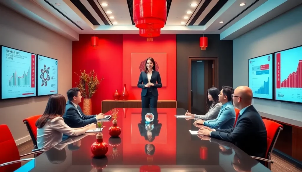 business team discussing Chinese luck strategies in a modern office.